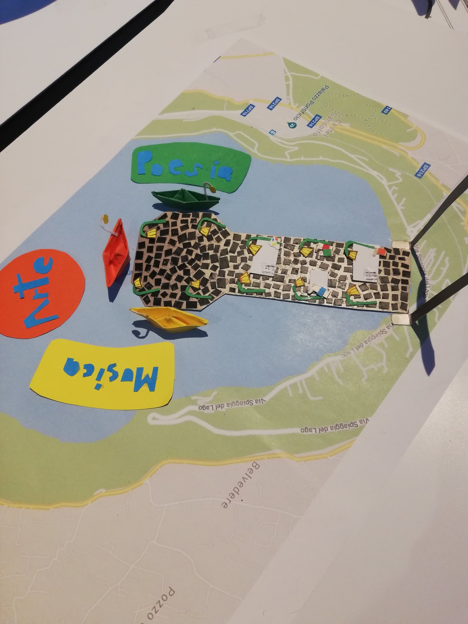 Si esce dal museo per immaginare un’istallazione site specific sul lago di Albano grazie a Elena e al suo “Impronte di natura”, che combina arte, musica e poesia. Sullo specchio d’acqua del lago di origine vulcanica la rotta più che la strada, grazie a barche e canoe, porta a isole artificiali, luoghi deputati per assistere a concerti, mostre di pittura e spettacoli teatrali.