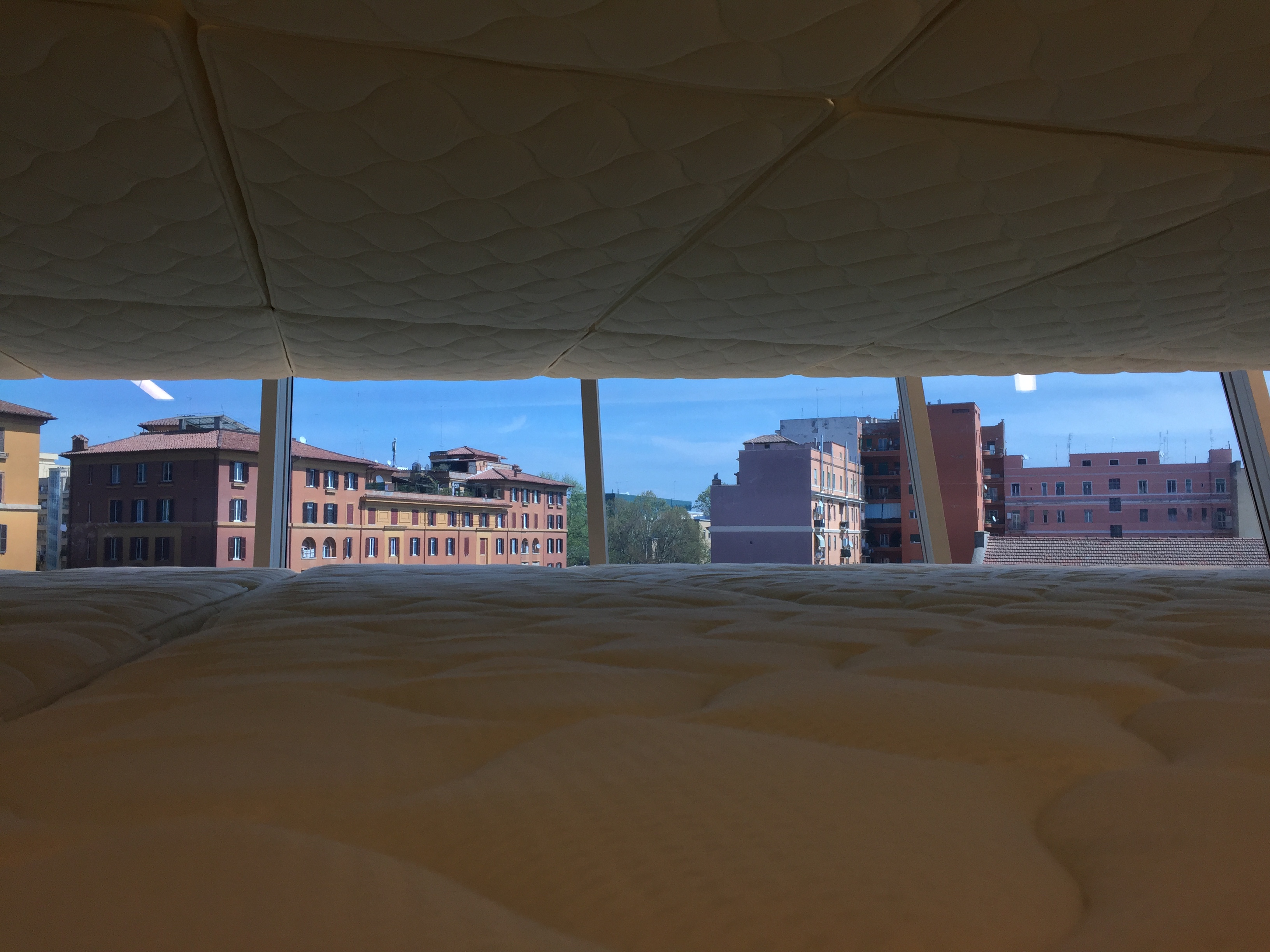 Tantissimi sono i materassi disposti ad “L”, per adeguarsi alla struttura della Galleria 5 del MAXXI, la più alta del museo, che lasciano agli spettatori la possibilità di toccare con mano l’avvolgente abbraccio della loro soffice stoffa. Letteralmente.
